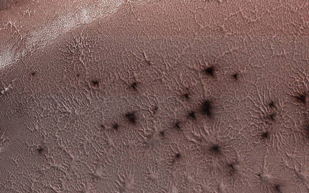 В северном полушарии Марса появились огромные черные "кляксы", похожие на пауков. Их фото сделал спутник NASA Mars Reconnaissance Orbiter.
