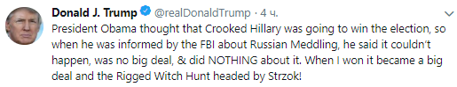 В еще одном посте, перед этим, Трамп написал, что Обама надеялся, что победит "бесчестная Хиллари Клинтон", поэтому не обратил внимание на информацию о вмешательстве России в выборы от ФБР и не сделал ничего по этому поводу. А также добавил, что большой проблемой российское вмешательство для демократов стало только после победы Трампа.