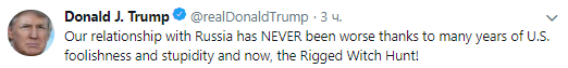 "Наши отношения с Россией никогда еще не были хуже, чем сейчас, благодаря многим годам глупости и тупости США, а сейчас еще и специально подстроенной охоте на ведьм", - написал Дональд Трамп, имея в виду действия экс-президента США Барака Обамы.