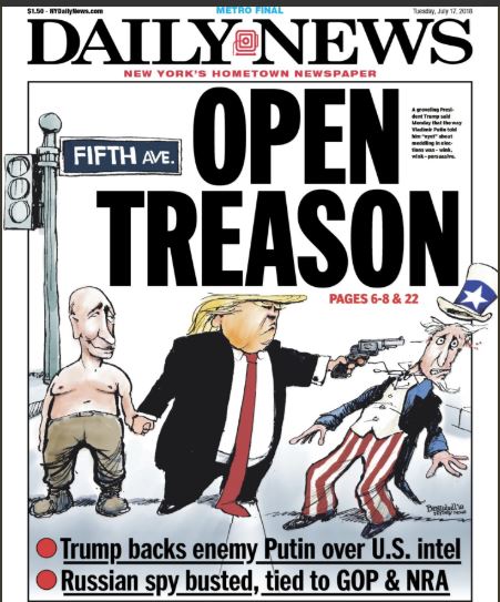 Президент США Дональд Трамп, держа за руку лидера РФ Владимира Путина, расстреливает знаменитый образ США - дядюшку Сэма. Так встречает читателя последний номер за 17 июля нью-йоркской Daily News.