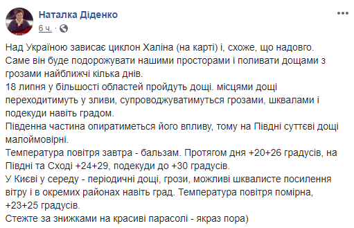 "Именно он будет путешествовать нашими просторами и поливать дождями с грозами ближайшие несколько дней. 18 июля в большинстве областей пройдут дожди. Местами дожди переходить в ливни, будут сопровождаться грозами, шквалами и иногда даже градом. Южная часть сопротивляться его влиянию, поэтому на юге существенные дожди маловероятны?" - написала Диденко.