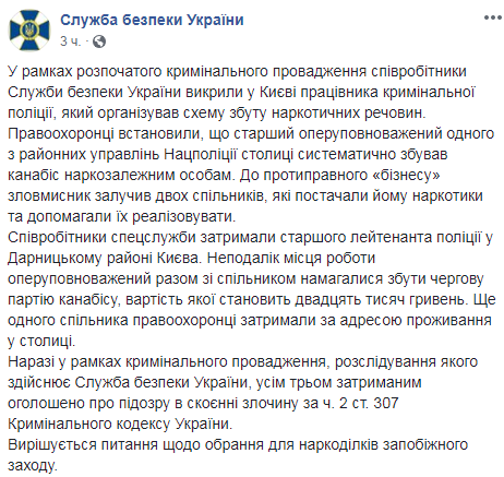 "Правоохранители установили, что старший оперуполномоченный одного из районных управлений Нацполиции столицы систематически сбывал каннабис наркозависимым лицам. К противоправному "бизнесу" злоумышленник привлек двух сообщников, которые поставляли ему наркотики и помогали их реализовывать", - указано в опубликованном сообщении.