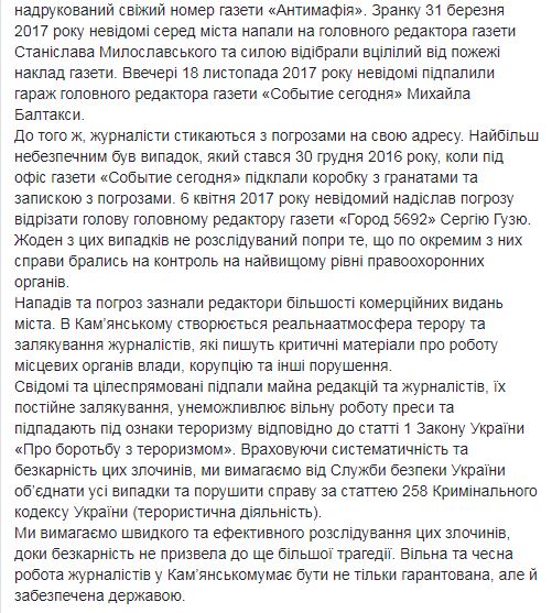 "Нападениям и угрозам подверглись редакторы большинства коммерческих изданий города. В Каменском создается реальная атмосфера террора и запугивания журналистов, которые пишут критические материалы о работе местных органов власти, коррупцию и другие нарушения", - говорится в заявлении.