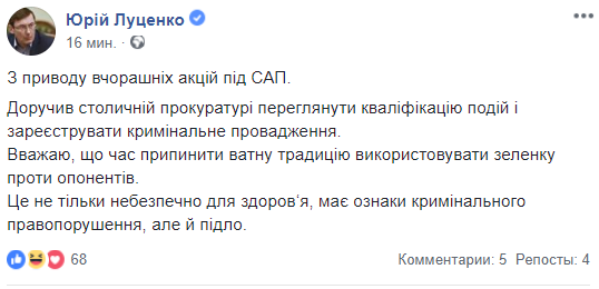 Генпрокурор Юрий Луценко прокомментировал вчерашнюю акцию протеста у здания САП с обливанием зеленкой. Он назвал поручил киевской прокуратуре проверить квалификацию событий и зарегистрировать уголовное производство. Об этом Луценко написал на своей странице в Facebook.