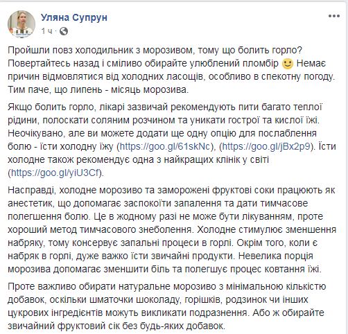 И.о. министра здравоохранения Ульяна Супрун заявила, что полезно есть мороженое, когда болит горло.