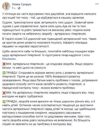 В Facebook она прокомментировала мифы, которые собрала врач-кардиолог Лариса Мищенко.