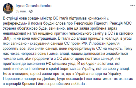 "В ленте новое предательство - министр МВД Италии поддержал крымский "референдум" и посмел (произнести) грязные слова про Революцию Достоинства. Реакция МИД Украины обязательно будет, конечно, но это заявление сделано сейчас не случайно (на фоне уничтожающей критики хельсинского саммита в ЕС и в мировых СМИ)", - заявила Геращенко.