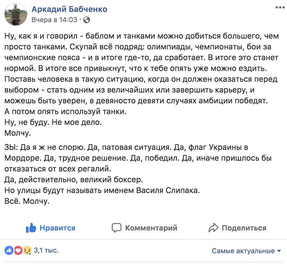 Ссора двух известных журналистов произошла в комментариях под постом Бабченко о победе Усика. В частности, Бабченко выразил мнение, что Усик поехал в Москву из-за карьерных амбиций и что он действительно великий боксер. При этом он отметил, что улицы в Украине все же будут называть именем известного украинского оперного певца Василия Слипака, который погиб в 2016 году в бою с сепаратистами на Донбассе.