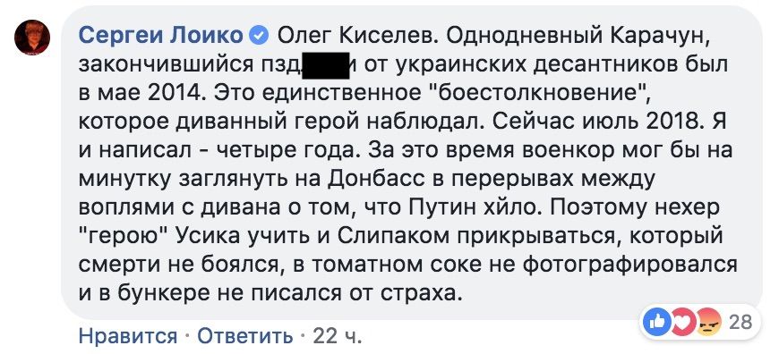 Далее последовал ряд сообщений, в котором комментаторы начали спорить о словах Лойко и напомнили ему, что Бабченко бывал в Славянске, но, правда, его тогда приняли за российского шпиона и сильно избили.