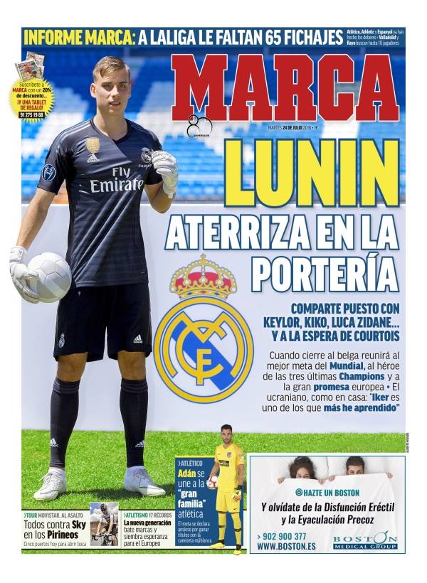Подписавший шестилетний контракт с мадридским "Реалом" украинский голкипер Андрей Лунин попал на обложку крупнейшего испанского спортивного издания Marca.