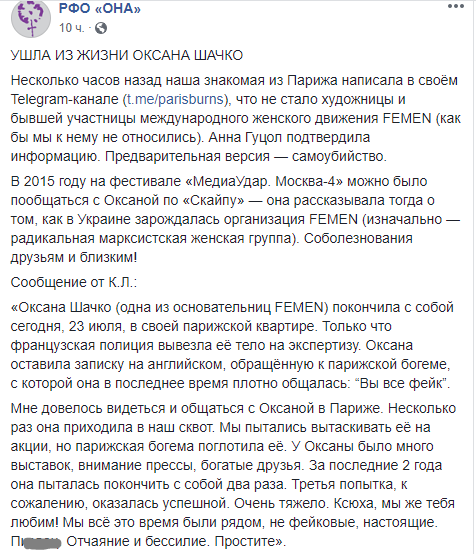 Лидер Femen Анна Гуцол в Facebook написала, что "нас покинула самая бесстрашная и самая ранимая" и что родные и друзья ждут официальных выводов полиции.
