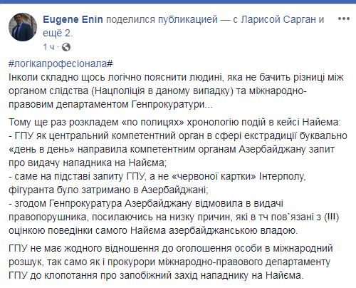 "Генпрокуратура Азербайджана отказала в выдаче правонарушителя, ссылаясь на ряд причин, в том числе связанных с оценкой поведения самого Найема азербайджанскими властями", -