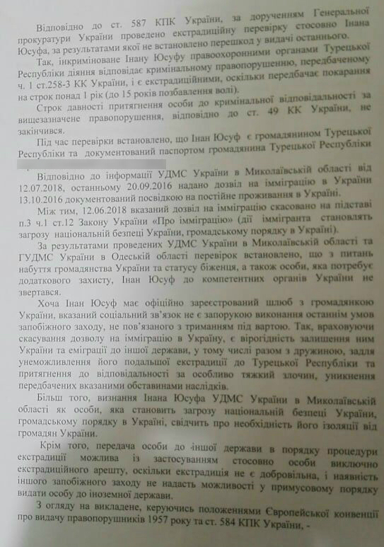 12 июня Государственная миграционная служба отменила Юсуфу Инана разрешение на иммиграцию на основании статьи закона об иммиграции в отношении действий, "которые представляют угрозу национальной безопасности и общественному порядку в Украине". Прокуратура Николаевской области не увидела оснований, по которым нельзя экстрадировать Юсуфа Инана. Заместитель прокурора Анатолий Жмура в своем ходатайстве настаивал, что из-за этого Юсуфа Инана нужно изолировать от граждан Украины, применив экстрадиционный арест.