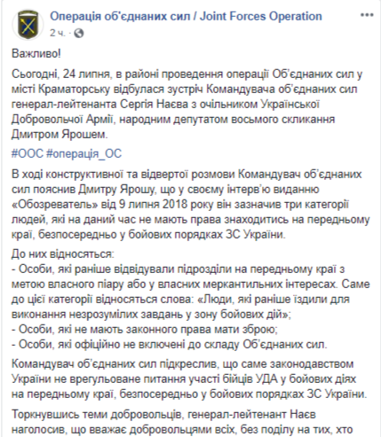 Повторимся, что реакция Яроша вышла слишком оперативно для такого рядового, как утверждают, фейка. Одновременно о встрече отчитались и в штабе ООС.