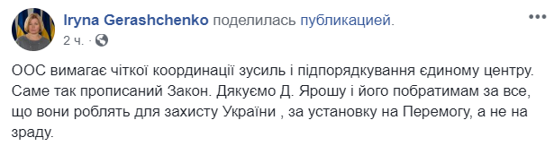 "ООС требует четкой координации усилий и подчинения единому центру. Именно так прописан Закон. Спасибо Д. Ярошу и его собратьям за все, что они делают для защиты Украины, за установку на Победу, а не на зраду".