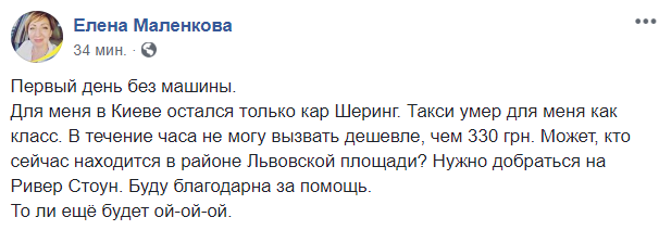 "Такси умер для меня как класс. В течение часа не могу вызвать дешевле, чем 330 грн", - пишет киевлянка Елена Маленкова.