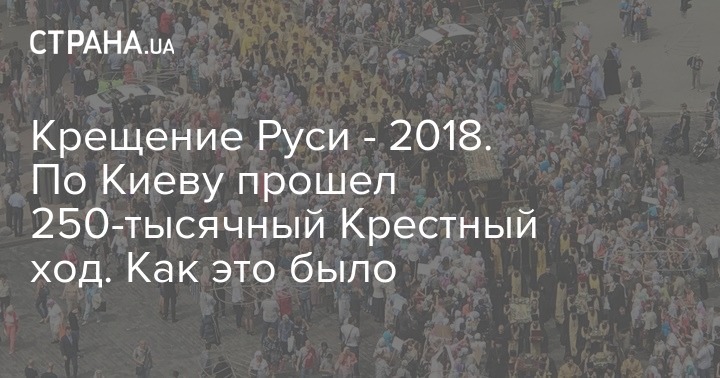15:36 Более 200 тысяч верующих пришли сегодня на молебен и Крестный ход по случаю 1030-летия Крещения Руси. Об этом "Стране" заявил управляющий делами УПЦ митрополит Антоний.