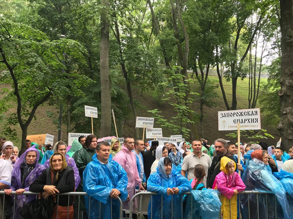 10:12 На Владимирской горке уже собираются паломники. Но дождь собрался раньше. Люди терпеливо мокнут в ожидании праздника.