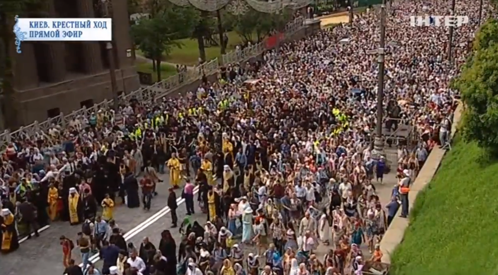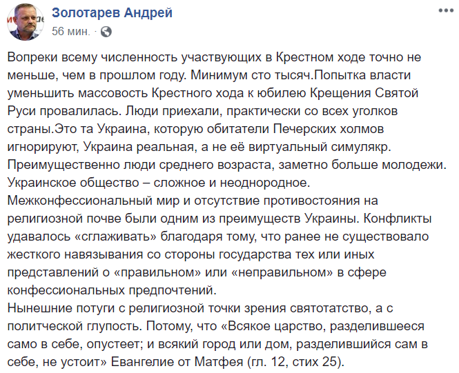 "Вопреки всему численность участвующих в Крестном ходе точно не меньше, чем в прошлом году. Минимум сто тысяч.Попытка власти уменьшить массовость Крестного хода к юбилею Крещения Святой Руси провалилась. Люди приехали, практически со всех уголков страны. Это та Украина, которую обитатели Печерских холмов игнорируют, Украина реальная, а не её виртуальный симулякр. Преимущественно люди среднего возраста, заметно больше молодежи.