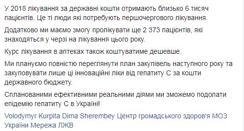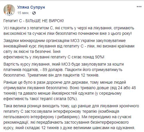 "Благодаря международным организациям, Минздраву Украины удалось закупить инновационный курс лечения от гепатита С - лекарства, которые признаны странами мира как качественные и безопасные. Их эффективность в лечении гепатита С достигает более 90%!", - сообщила она.