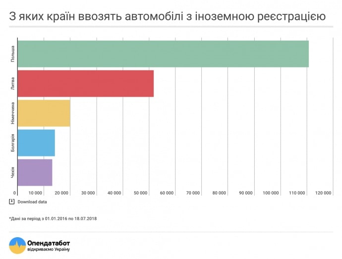 По состоянию с начала года до 18 июля января 2018 года, самое большое количество авто на "евробляхах" въехало в Украину из Польши - более 110 тысяч. С территории Литвы завезли 51,7 тыс авто. Третье место за Германией – из этой страны в Украину попало 19,8 тыс авто машин на иностранных номерах. На четвертом – Болгария (4,1 тыс. авто). Из Чехии ввезли 3,1 тыс. машин.