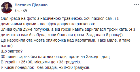 "Вот такая красота на фото с насыщенной травой, хоть сам пасись, и с дымящимися горами - последствие утреннего дождя. Ливень был мощным, а от грозы даже содрогалась хата. С детства уже и забыла, когда боялась грозы. Вспомнила в 6.00", - отметила Диденко.