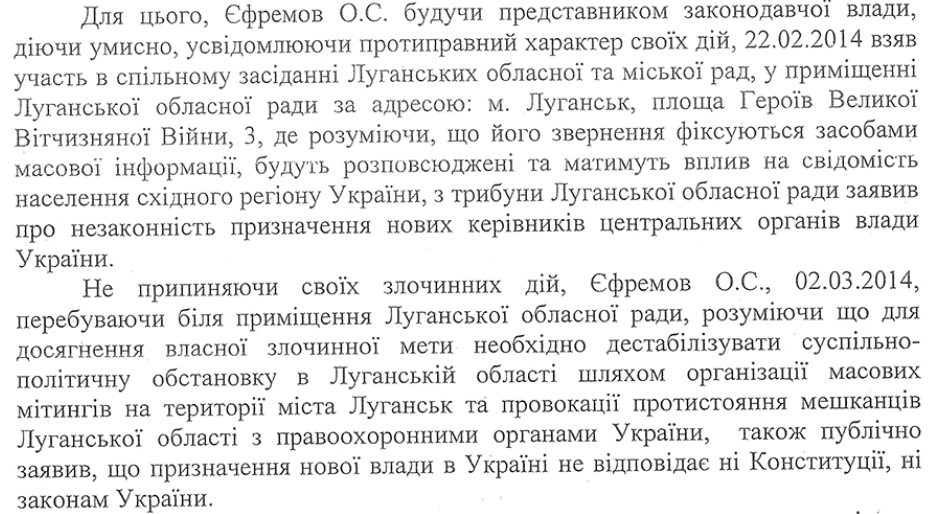 Учитывая, что реальных доказательств участия Ефремова в организации мятежа против Киева нет, то следствие постаралось прописать вину экс-нардепа по косвенным признакам. Как то: его недовольство новоназначенным после победы Майдана губернатором или слова о том, что в Киеве обосновалась незаконная власть.