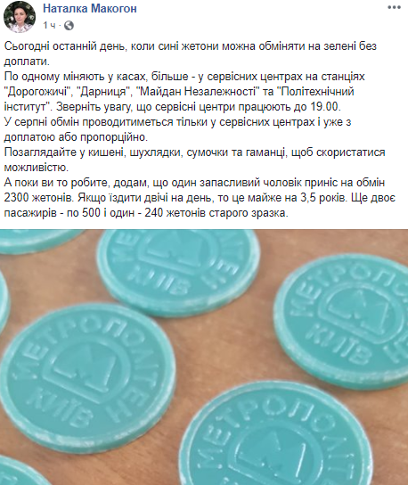 "Обратите внимание, что сервисные центры работают до 19.00. В августе обмен будет проводиться только в сервисных центрах и уже с доплатой или пропорционально. Загляните в карманы, ящички, сумочки и кошельки, чтобы воспользоваться возможностью. А пока вы это делаете, добавлю, что один запасливый мужчина принес на обмен 2300 жетонов. Если ездить дважды в день, то это почти на 3,5 года. Еще двое пассажиров - по 500 и один - 240 жетонов старого образца", - сообщила пресс-секретарь Наталья Макогон.