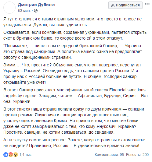 В этот список наша страна попала сразу по двум причинам - санкции против режима Януковича и санкции против должностных лиц, участвующих в аннексии Крыма. Но прикол в том, что многие банки даже не хотят заморачиваться с тем, кто кому Янукович! Украина? Простите, санкции, не хотим связываться, до свидания", - сообщил он.