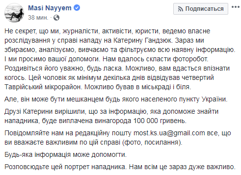 "Не секрет, что мы, журналисты, активисты, юристы, ведем собственное расследование по делу нападения на Екатерину Гандзюк. Сейчас мы собираем, анализируем, изучаем и фильтруем всю имеющуюся информацию. И мы просим вашей помощи. Нам удалось составить фоторобот. Рассмотрите его внимательно, пожалуйста. Возможно, вам удастся узнать кого-то. Этот человек как минимум несколько дней посещал четвертый Таврический микрорайон. Возможно, бывал в горсовете или около. Распространите этот портрет нападавшего. Нам всем это сейчас очень важно", - написал Найем.