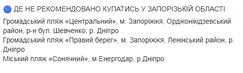 Не рекомендуется купаться на пляжах Винницы, Ковеля Волынской области, Староконстантинова Хмельницкой области, Черкасс, Днепра, Кривого Рога, Каменского возле речпорта, Павлограда и Верхнеднепровска Днепропетровской области, Запорожья, Энергодара, в Николаеве, Полтаве, Кременчуге и Горишних Плавнях.