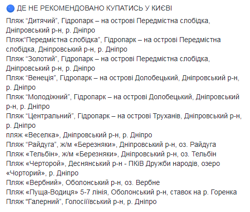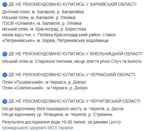 В список нерекомендованных попали пляжи в рекреационных зонах ряда городов Винницкой и Житомирской областей, Чернигова на Десне, а также некоторые пляжи рек Уж, Латорица, Синявка и Иршавка в Закарпатье.