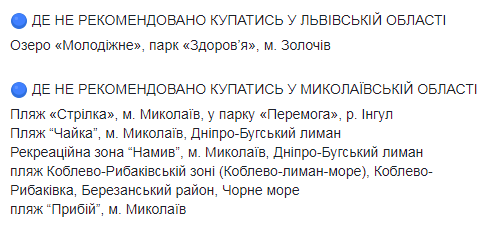 Не рекомендуется купаться на "Новониколаевском пляже" в Кропивницком, а также в Александрии и Светловодске Кировоградской области, в Северодонецке и Старобельске Луганской области, в г.Коростень Житомирской области, "Молодежном" пляже в Золочеве Львовской области, в Ривном и городах Здолбунов, Дубровица, Радивилов и Дубно Ривненской области.