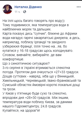 "В течение дня ожидается + 27... + 33 градуса. Дождей существенных - вряд ли, разве что в Винницкой, Хмельницкой, Черновицкой, Ивано-Франковской и Сумской областях вероятные короткие локальные дожди и грозы. В Киеве в пятницу будет сухо и жарко, в течение дня + 28 ... + 30 градусов. Между прочим, температура воды возле Киева, по данным нашего Гидрометцентра, 24,8 градусов," -написала она.