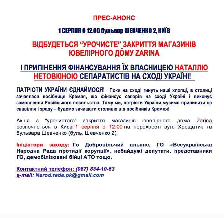 Ювелирный дом "Zarina" организовал пресс-конференцию после акции "торжественного закрытия", которое обещали устроить радикалы. В листовках перед акцией говорилось, что владелица дома Наталья Нетовкина якобы финансирует "сепаратистов на востоке Украины".