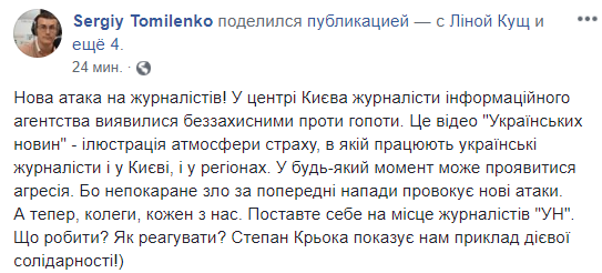 "В центре Киева журналисты информационного агентства оказались беззащитными против гопоты. Это видео "Украинских новостей" - иллюстрация атмосферы страха, в которой работают украинские журналисты и в Киеве, и в регионах. В любой момент может проявиться агрессия. Потому ненаказанное зло за предыдущие нападения провоцирует новые атаки. А теперь, коллеги, каждый из нас. Поставьте себя на место журналистов "УН". Что делать? Как реагировать? Степан Крьока показывает нам пример действенной солидарности!", - написал глава НСЖУ.