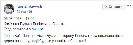 "05.08.2018 в 17:00 Каменка-Бугская, Львовская область. Град размером с вишню. Трасса Киев - Чоп, от города Буск в сторону Львова гроза поскидала ветви деревьев на трассу, водители будьте внимательны и осторожны!", - написал депутат.