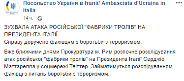 Римская прокуратура начнет расследование атак российской "фабрики троллей" на президента Италии Сержио Матарелла. Об этом сообщает пресс-служба Посольства Украины в Италии в Facebook.