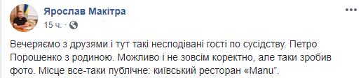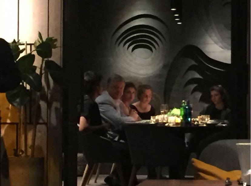 Снимок обнародовал политтехнолог Ярослав Макитра. Он написал, что за ужином внезапно обнаружил, что по соседству с ним в ресторане находится президент с семьей.