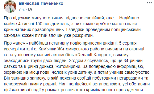 В Житомирской области 34-летний мужчина убил свою 8-лентюю дочь и покончил с собой. Об этом сообщает начальник полиции Житомирской области Вячеслав Печененко на своей странице в Facebook.