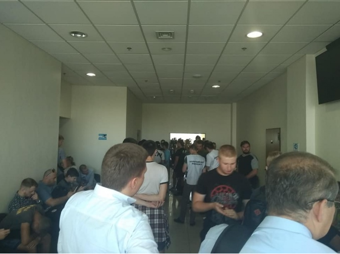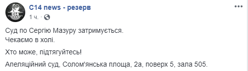 Во вторник, 7 августа, в Апелляционный суд Киева, который рассматривает жалобу на меру пресечения лидеру С14 Сергею Мазуру, пришли около сотни националистов. На странице С14 в Facebook сообщается, что националисты пришли на заседание, которое немного задерживается, и ждут начала суда в холле.
