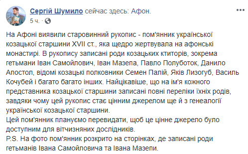 Директор Международного института афонского наследия в Украине Сергей Шумило показал старинную рукопись - помянник украинской казацкой старшины XVII в., которую обнаружили на Афоне. Об этом он написал в Facebook.