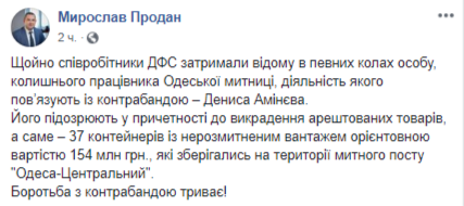 "Сотрудники ГФС задержали известного в определенных кругах человека, бывшего сотрудника Одесской таможни, деятельность которого связывают с контрабандой, - Дениса Аминева. Его подозревают в причастности к краже арестованных товаров", - написал Продан на странице в Facebook в среду вечером.