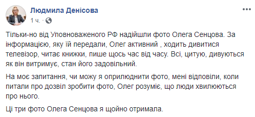 полномоченный Верховной Рады по правам человека Людмила Денисова обнародовала на своей странице в Facebook  три фотографии политзаключенного, украинского режиссера Олега Сенцова, заключенного в колонии "Белый медведь" в г.Лабытнанги, присланные российской стороной.
