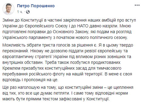"Изменения в Конституцию в части закрепления наших амбиций о вступлении Украины в Европейский Союз и НАТО давно назрели. Мною подготовлены поправки в Основной закон, которые я подам на рассмотрение украинского парламента с началом нового политического сезона", - написано на странице главы государства в Фейсбуке в четверг, 9 августа.
