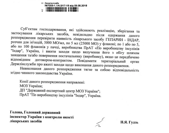 Также на территории Украины запрещено реализовывать, применять и хранить раствор для инъекций "Гепарин-Индар" Серия АВ 178-1/1, 5000 МЕ/мл, по 5 мл (25000 МЕ) во флаконе; по 1 или по 5, или по 100 флаконов в пачке, ООО "Юрия-Фарм", Украина.