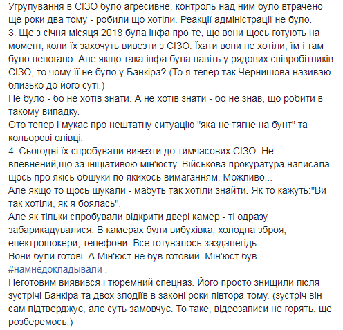 "Еще с января 2018 была инфа о том, что они что-то готовят на момент, когда их захотят вывезти из СИЗО. Ехать они не хотели, им и там было неплохо. Но если такая инфа была даже у рядовых сотрудников СИЗО, то почему ее не было в Банкира? (Это я теперь так Чернышева называю - близко к его сути. (заместитель министра юстиции Денис Чернышев - Прим.Ред.). Не было - потому что не хотел знать. А не хотел знать - не зная, что делать в таком случае.