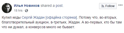 "Купил кеды Сергея Жадана. Потому что, во-вторых, благотворительный аукцион, в-третьих, Жадан. А во-первых, кто бы что ни думал, а "Конверс" (марка кед - Прим. Ред.) много не бывает ", - написал он в Facebook.