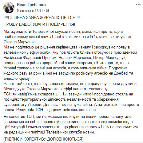 "Мы, журналисты Телевизионной службы новостей, узнали о том, что в ближайшем сезоне шоу "Танцы со звездами" на "1+1" может принять участие Оксана Марченко. Мы не разделяем это решение руководства канала и осуждаем появление в телевизионном эфире лица, которое связывают близкие отношения с президентом Российской Федерации Путиным. Муж Марченко, Виктор Медведчук, неоднократно делал пророссийские заявления, в частности, якобы о том, что в Украине идет не внешняя агрессия, а гражданская война. Супруги ни разу за годы войны не осудили российскую агрессию в Донбассе и аннексию Крыма. Даже тот факт, что шоу является развлекательным, не оправдывает появления жены Медведчука Оксаны Марченко в эфире нашего телеканала", – говорится в заявлении.