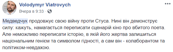 "Медведчук продолжает свою войну против Стуса. Сейчас он демонстрирует силу: говорят, пытается переписать сценарий кино об убитом поэте. Но невозможно переписать историю, в которой его жертва останется национальным гением и символом достоинства, а сам он – коллаборантом и политиком-неудачником", – пишет в соцсети глава Института национальной памяти Владимир Вятрович.